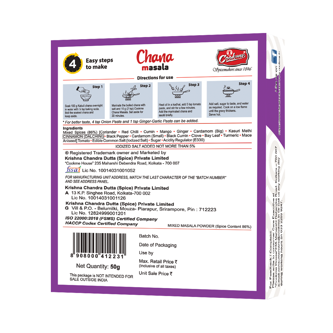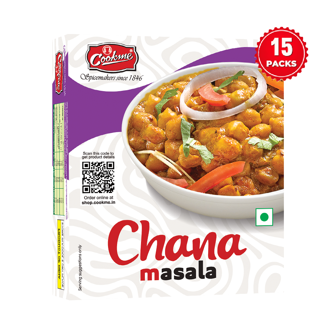 Soak Kabuli chana in water with pinch of baking soda (¼ tsp) and allow standing overnight. Boil soaked chana and keep aside. Now marinate the boiled chana with salt and ‘Cookme Chana Mix’ and keep it aside for 30 minutes. Heat oil in a kadhai and add tomato paste in it and stir for few minutes. Now add the marinated chana in it and stir for a while. Add salt and sugar to taste and water as per requirements. Cook on a low flame till gravy thickens. Serve hot.