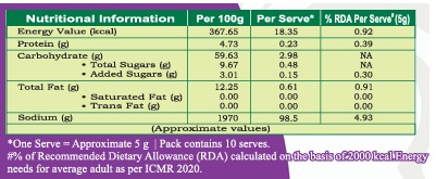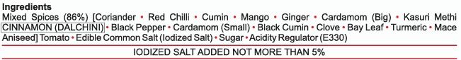 Coriander, Red Chilli, Cumin, Mango, Ginger, Sugar, Cardamom (Big), Kasuri Methi, Cinnamon, Common Salt, Black Pepper, Cardamom (Small), Black Cumin, Clove, Bay Leaf, Acidity Regulator (E330), Turmeric, Flavouring Agent