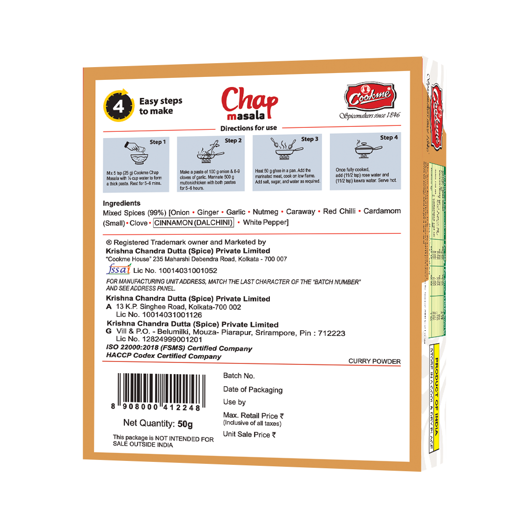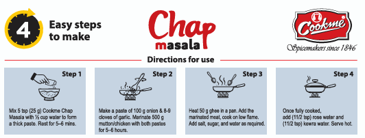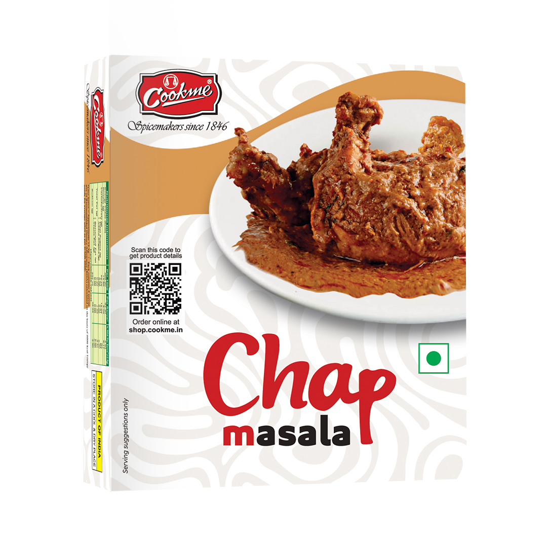 Take a bowl and add 5 tsp (25 g) ‘Cookme Chap Mix’ with half cup water to make a thick paste and keep aside for 5-6 minutes. Make a paste with onion and garlic and keep aside. Marinate the mutton/chicken with onion-garlic paste and the paste made with ‘Cookme Chap Mix’ and keep it aside for 5-6 hours. Heat ghee in a pan, pour the marinated mutton/chicken in it and cook on a low flame. Add salt and sugar to taste and water as per requirement. When it is completely cooked, add rose water and kewra water in it. Serve hot.