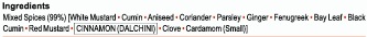 White Mustard, Cumin, Aniseed (Small), Coriander, Ginger, Fenugreek, Bay Leaf, Black Cumin, Red Mustard, Parsley, Cinnamon, Cardamom (Small)