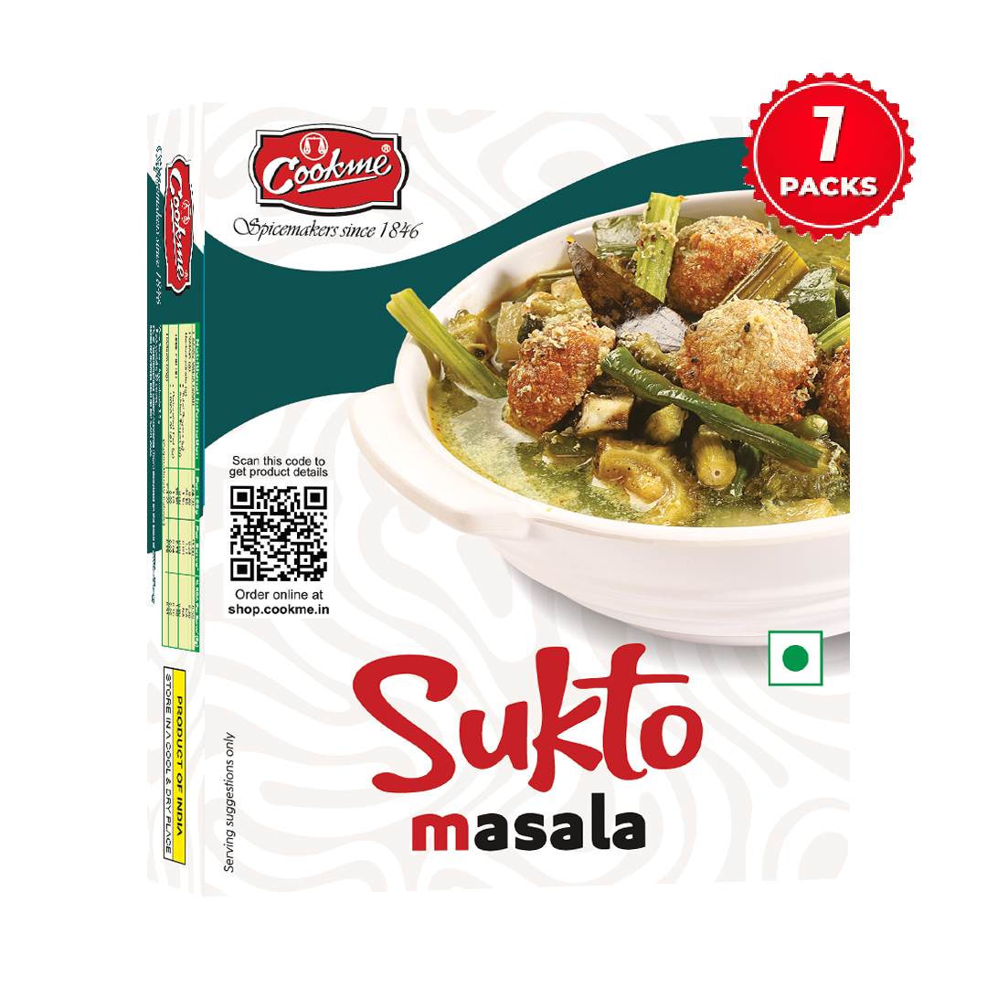 Take a bowl, mix ‘Cookme Sukto Masala Mix’ with water to make a thick paste. Heat 1 tbsp oil in kadhai. Add bori and bitter gourd, fry nicely and keep aside. Now add other vegetables in oil and fry lightly. Add salt to taste and water as per requirement. When the vegetables are boiled, add the paste made with ‘Cookme Sukto Mix’ in it along with fried bitter gourd and bori. Cook for sometime on low flame. Add sugar to taste and ghee as per requirement.